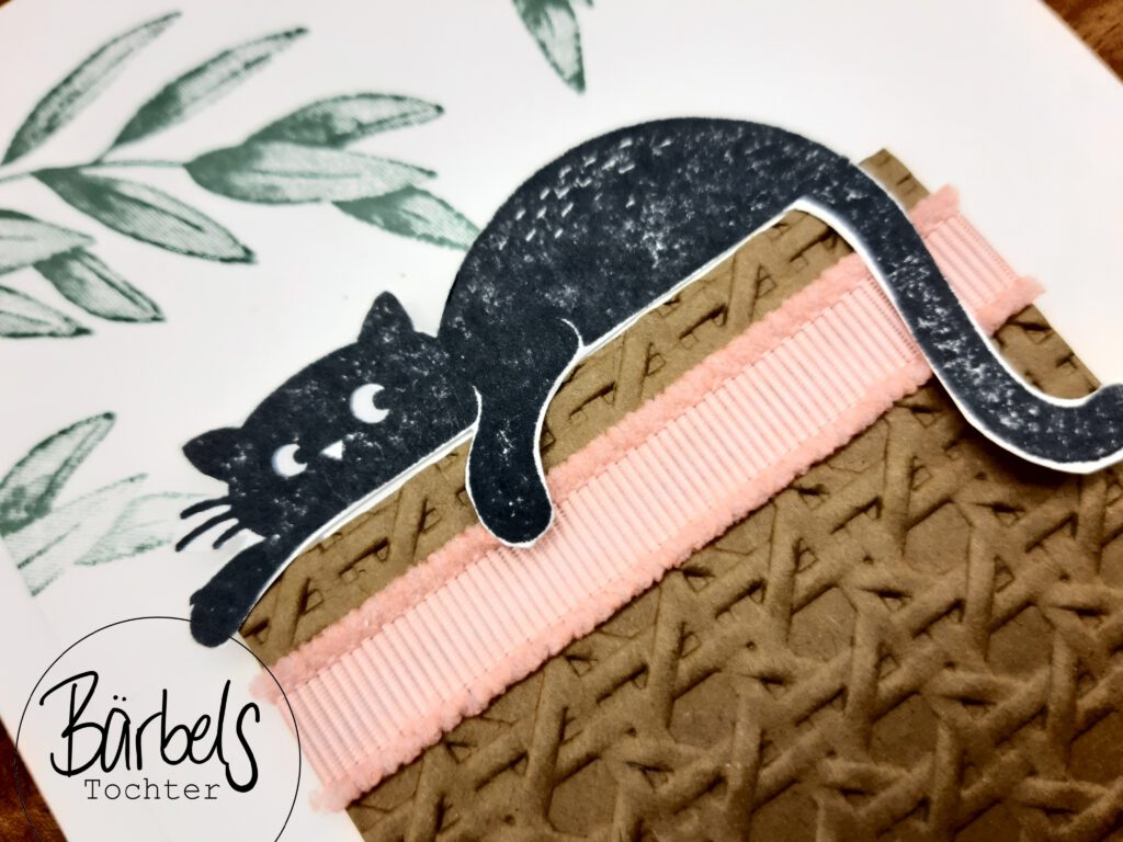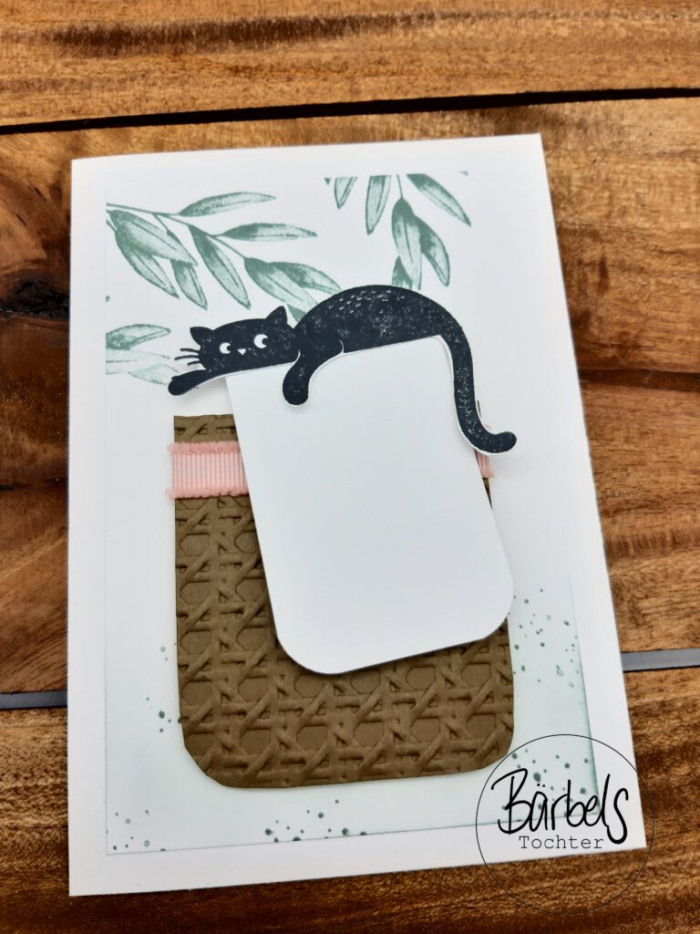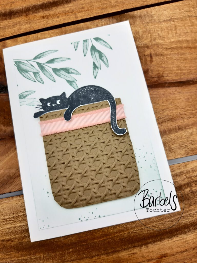 Die Katze stammt aus dem Stempelset LOVE CATS und den Korb habe ich mit der 3D Prägeform RATTAN GEFLECHT gestaltet.